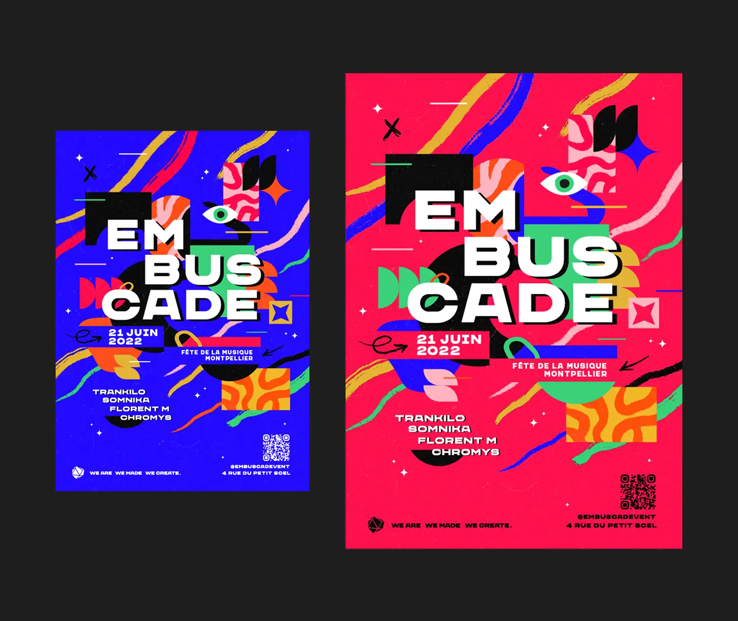 Pour leur tout premier événement public, organisé à l’occasion de la Fête de la Musique 2022, ils avaient besoin d’un système visuel complet, capable à la fois de refléter leur univers artistique, de se démarquer dans le paysage local, et de créer une unité graphique déclinable.