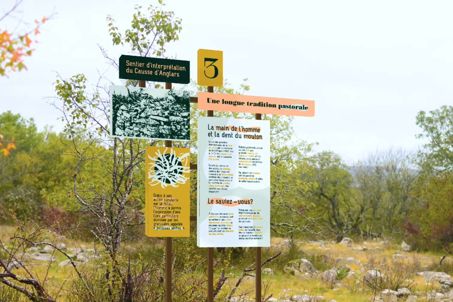 Pour accompagner l’expérience du visiteur, le Sentier du Causse devait faire l’objet d’un nouveau dispositif de signalétique.